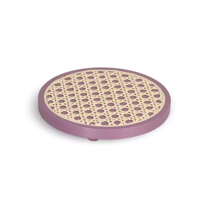 Bandeja redonda com detalhe em palha, feita em MDF com pintura laqueado fosco.