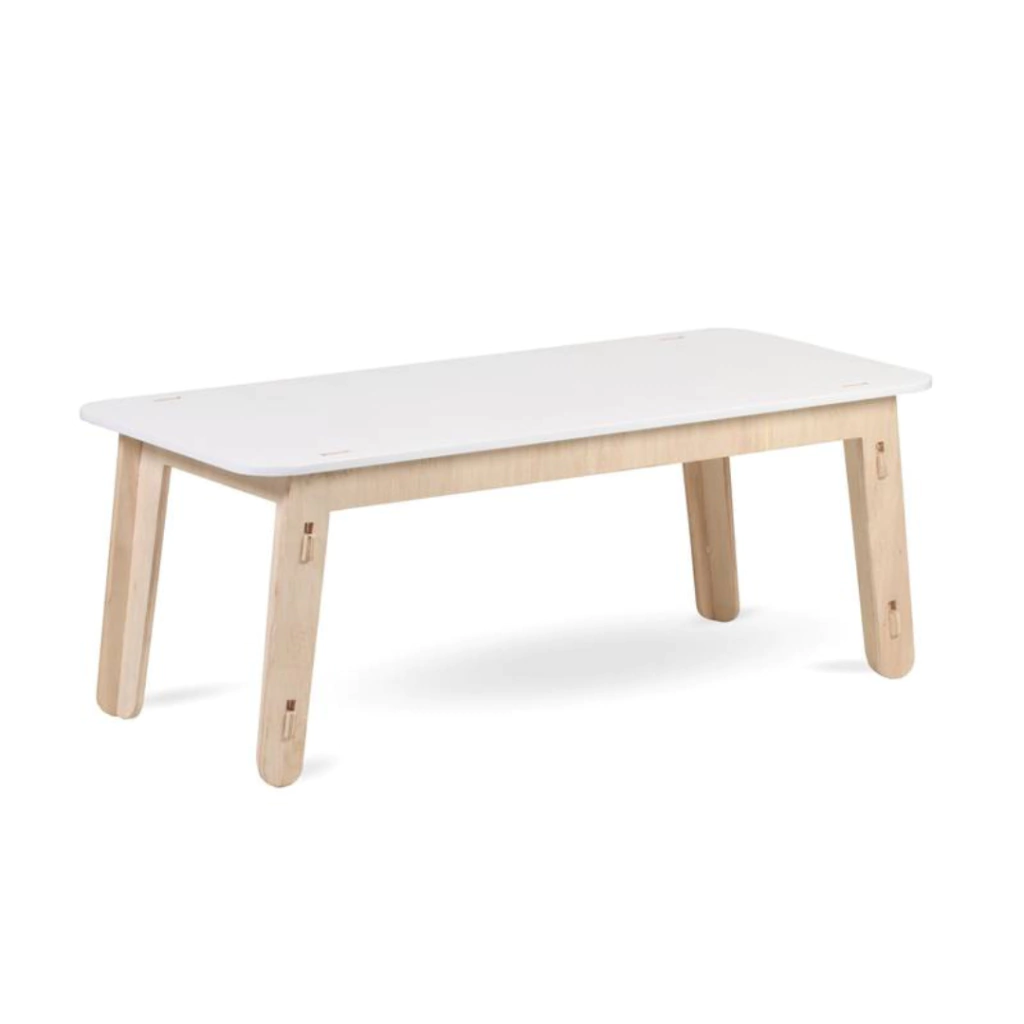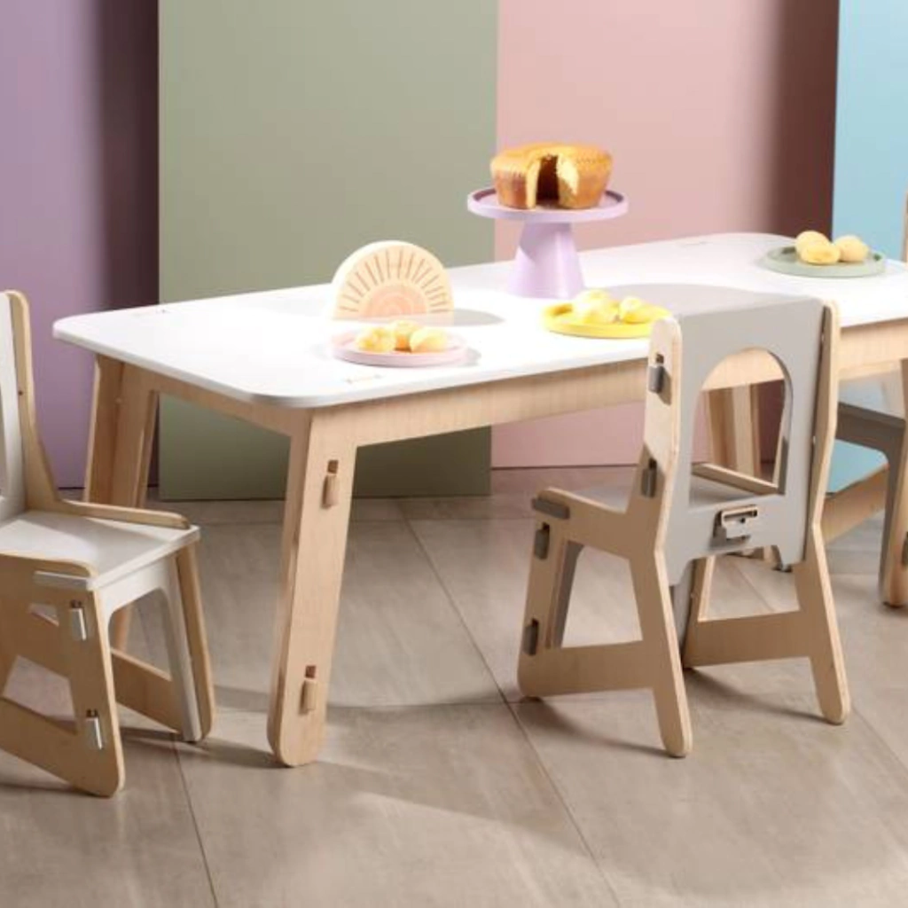 Mesa Infantil com tampo em MDF com pintura laqueado fosco e pés em madeira de pinus.